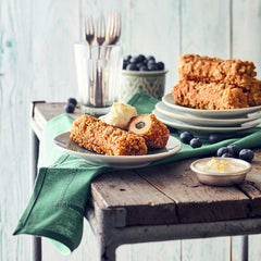 1Den Frischkäse mit Puderzucker und Zitrone kräftig verschlagen; die Blaubeeren unterheben. Die Eier in einen tiefen Teller geben und mit der Milch und dem Puderzucker verquirlen. Kölln Multikorn Fleks® in einen Gefrierbeutel geben und mit dem Nudelholz zerdrücken. Zerdrückte Kölln Multikorn Fleks® in einen tiefen Teller geben.