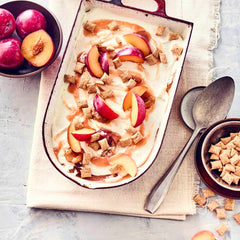 3Mascarpone mit Quark, Milch, Vanillezucker und Zucker verrühren. Den Boden einer Auflaufform (24 x 18 cm) mit den Kölln Haferkissen-Bröseln auslegen und mit restlichem Orangensaft tränken. ¾ des abgekühlten Pflaumenkompotts auf den Haferbröseln verteilen. Mascarpone-Quark-Creme auf das Kompott geben und glatt streichen. Das übrige Pflaumenkompott pürieren und auf die Creme streichen. Für 2-3 Stunden in den Kühlschrank stellen. Zubereitungszeit: ca. 40 Minuten (ohne Wartezeit)