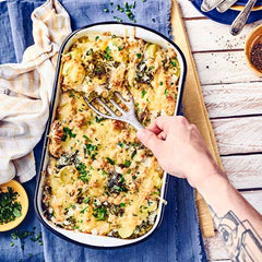 3Kartoffeln in Scheiben schneiden und die Hälfte auf den Boden einer feuerfesten Form geben. Grünkohl mit den Zwiebeln darauf verteilen. Die restlichen Kartoffeln darüber legen.