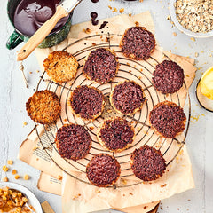 2Zwei Backbleche mit Backpapier belegen. Einen Metallring oder eine runde Ausstechform, etwa 6 cm Ø abspülen und auf ein Backblech setzen. 1-2 TL Florentinermasse einfüllen und mit einem abgespülten Löffelrücken flach drücken, Ring oder Ausstechform entfernen. Auf diese Weise insgesamt etwa 35 Taler auf die Backbleche geben.