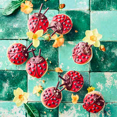 2Für den Guss Puderzucker in eine Schüssel sieben und mit Milch zu einer dickflüssigen Masse verrühren. Rote Lebensmittelfarbe in den Guss geben. Die Muffins damit bestreichen.