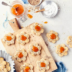 3Je einen halben Teelöffel Aprikosen-Konfitüre auf die noch warmen Plätzchen setzen.