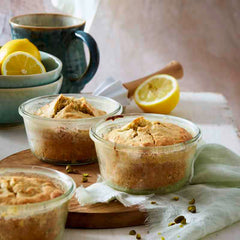 2Butter in einem Topf schmelzen, zur Eischaummasse geben. Mehl, Kölln Haferkleie Flocken, Pistazien und Backpulver mischen, esslöffelweise unterheben. Zitronensaft und -schale vorsichtig unterrühren.