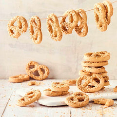 2Backofen vorheizen. Arbeitsfläche mit Mehl ausstreuen, den Teig ausrollen und mit einer Brezel-Ausstechformen ausstechen. Gebäck auf ein mit Backpapier ausgelegtes Backblech legen, mit Wasser befeuchten und mit Sesam bestreuen. Im Ofen backen, anschließend auskühlen lassen. Zubereitungszeit: ca. 30 Minuten (ohne Wartezeit)