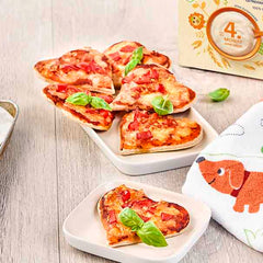 1Alle Teigzutaten in eine Schüssel geben und zu einem geschmeidigen Teig verkneten. Pizzateig auf einer bemehlten Arbeitsfläche ausrollen und kleine Herzen (ca. 5 cm) ausstechen. Herzen auf ein mit Backpapier ausgelegtes Backblech legen.