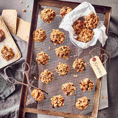 2Teig mit den Händen kneten, auf einem mit Backpapier ausgelegten Backblech kleine Häufchen legen und etwas flach drücken.