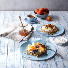 3Obst waschen und in Scheiben schneiden. Zum Anrichten den gefrorenen Müsliboden vorsichtig aus der Form drücken, mit Joghurt besteichen und mit Obst und Walnüssen belegen. Bei Bedarf mit Honig süßen und sofort verzehren. Zubereitungszeit: ca. 20 Minuten (ohne Wartezeit)