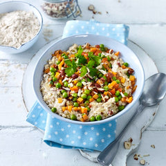 5800 ml Gemüsebrühe in einem Topf aufkochen. Vom Herd nehmen. Kölln Haferkleie Flocken und fein gehackte Nüsse zufügen, unterrühren und 2–3 Minuten quellen lassen. Gehackte Petersilie unterrühren. Porridge in Schalen anrichten. Gemüse-Mischung darauf geben. Mit grob gehackten Nüssen bestreuen und mit übriger Petersilie garnieren. Zubereitungszeit ca. 45 Minuten
