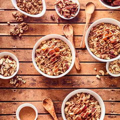 2Porridge in eine Schale füllen und Kölln Müsli hinzugeben. Nüsse und Dattelstücke auf das Porridge geben und mit Mandelmus garnieren.