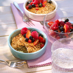 2Banane schälen und mit einer Gabel fein zerdrücken. Alle weiteren Zutaten miteinander vermengen und fünf Minuten quellen lassen. Anschließend die Masse gleichmäßig in eine ofenfeste Form geben und im Backofen backen.