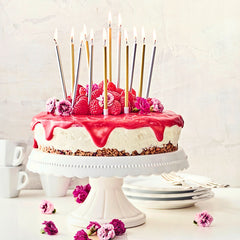 3Für das Topping Himbeeren mit Vanillezucker pürieren und durch ein Haarsieb passieren. Roten Tortenguss in 70 ml Wasser lösen und zusammen mit dem Himbeerpüree langsam nach Packungsanweisung erhitzen. Kurz abkühlen lassen. Den Tortenring abnehmen. Das Himbeerpüree auf die Torte geben und seitlich runterlaufen lassen. Mit Himbeeren und essbaren Blüten dekorieren und servieren.