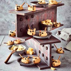 2Backofen vorheizen. Aus einer Teigkugel (4 cm) ca. 20 Mäuse formen. Mit Rosinen, Schokorosinen, Mandelblättchen und Salzstangen Gesicht und Schwanz gestalten. Die Mäuse auf ein mit Backpapier belegtes Blech setzen und backen.