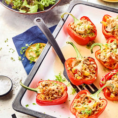 2Paprikahälften in eine gefettete Auflaufform setzen, füllen und mit Gemüsebrühe angießen. Auf mittlerer Einschubleiste backen. Nach 20 Minuten mit Käse bestreuen und weitere 10 Minuten gratinieren. Ober-/Unterhitze: 180 °C Umluft: 160 °C Garzeit: 30 Minuten Zubereitungszeit: ca. 25 Minuten