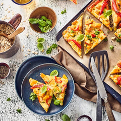 4Auf mittlerer Schiene abbacken. In Dreiecke schneiden und warm oder kalt servieren. Ergibt ca. 18 Stücke. Ober-/Unterhitze: 200°C Umluft: 180°C Backzeit: ca. 30-40 Minuten Zubereitungszeit: ca. 40 Minuten