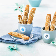 2Die Frucht-Masse verknetest Du dann mit dem Mazola® und Kölln Schmelzflocken® zu einem glatten Teig. Daraus ca. zeigefingerlange und -dicke Stangen formen, in Sesam wälzen und auf ein mit Backpapier ausgelegtes Backblech legen. Im Backofen auf mittlerer Schiene backen.