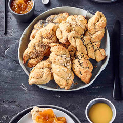 Sesam, Mohn, Kümmel, Kernige Köllnflocken und geriebenen Emmentaler zum Verzieren