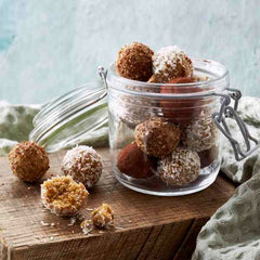 2Mandeln, Aprikosen-Dattelmix, Mandelmus und Köllnflocken verkneten. Aus der Masse ca. 30 kleine Kugeln formen. Jeweils 10 Bällchen in Kokosraspeln, Leinsamen und Kakaopulver wälzen.
