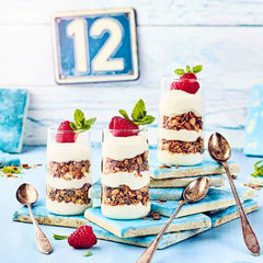 2Creme und Kölln Müsli schichtweise in hohe, schmale Gläser füllen, mit Kölln Müsli abschließen und mit Himbeeren dekoriert sofort servieren.