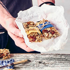 1Butter zusammen mit Zucker sowie Honig in einem Kochtopf schmelzen. Zitronensaft, Echte Kölln Kernige, Kölln Vollkorn Haferfleks®, Haselnüsse sowie Sonnenblumenkerne hinzufügen und unter ständigem Rühren goldbraun rösten. Trockenpflaumen, -datteln sowie –aprikosen würfeln und zusammen mit den Rosinen unter die Masse rühre