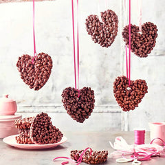 2Die Masse in die Mulden einer beschichteten Herz-Muffinform füllen und mit einem Löffel festdrücken. Strohhalme in sechs Teile schneiden und in die Herzen drücken. Über Nacht kühl stellen. Am nächsten Tag aus der Form lösen, die Strohhalme entfernen und mit Geschenkband aufhängen.