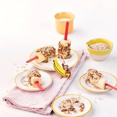 1Die Banane schälen und halbieren. Die beiden Bananenhälften steckst du nun auf die Holzstäbchen. Die Rosinen hackst du klein und vermischt sie mit den Kölln Multikorn Flocken und den gemahlenen Mandeln. Die Banane bestreichst du mit dem Joghurt und wälzt sie anschließend in der Müslimischung. Zubereitungszeit: ca. 15 Minuten