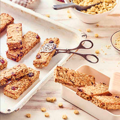 1Alle Zutaten in einer Schüssel mit einer Gabel vermischen und durchkneten. Mit Hilfe eines Teigschabers auf ein Backblech streichen und auf einer Fläche von ca. 20 x 20 cm fest andrücken. Anschließend backen, aus dem Ofen nehmen und noch warm in Riegel schneiden. Ober- /Unterhitze: 180 °C Umluft: 160 °C Backzeit: 15-20 Minuten Zubereitungszeit: ca. 30 Minuten