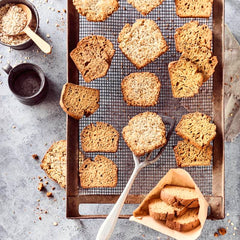 5Am Folgetag das Brot in ca. 1 cm dicke Scheiben schneiden. Jede Scheibe in Kölln Haferdrink tauchen und in Kokosraspel wälzen. Auf einem Gitter im Backofen bei 100 °C möglichst mit Umluft etwa eine Stunde trocknen. Zubereitungszeit: ca. 25 Minuten (ohne Wartezeit)