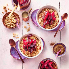 2Porridge in eine Schale füllen und Kölln Müsli, Pflaumenkompott und Pflaumenspalten hinzugeben. Zu guter Letzt Zimt nach eigenem Belieben über das Obst pudern.