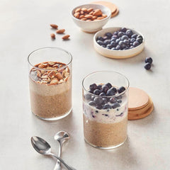 1High Protein Köllnflocken Oat, Mandeln, Zimt und Milch verrühren, in 2 Gläser füllen.