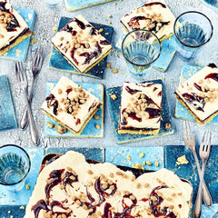 4Nach dem Auskühlen mit 350 g Pflaumenmus bestreichen. Sahne mit Sahnesteif steif schlagen, auf dem Kuchen verteilen und mit restlichem Pflaumenmus verzieren. Zum Schluss die Kölln Haferfleks® über den Blech-Friesen verteilen. Vor dem Servieren kühl stellen!